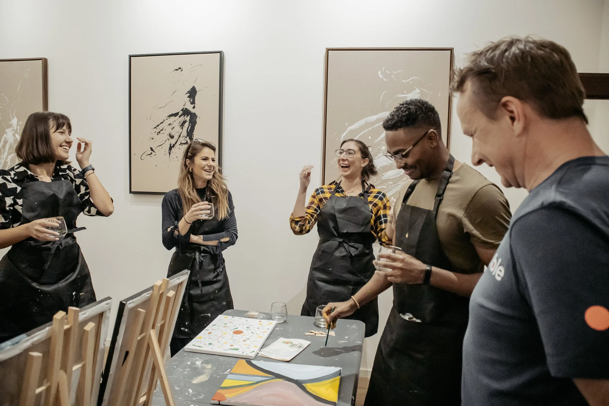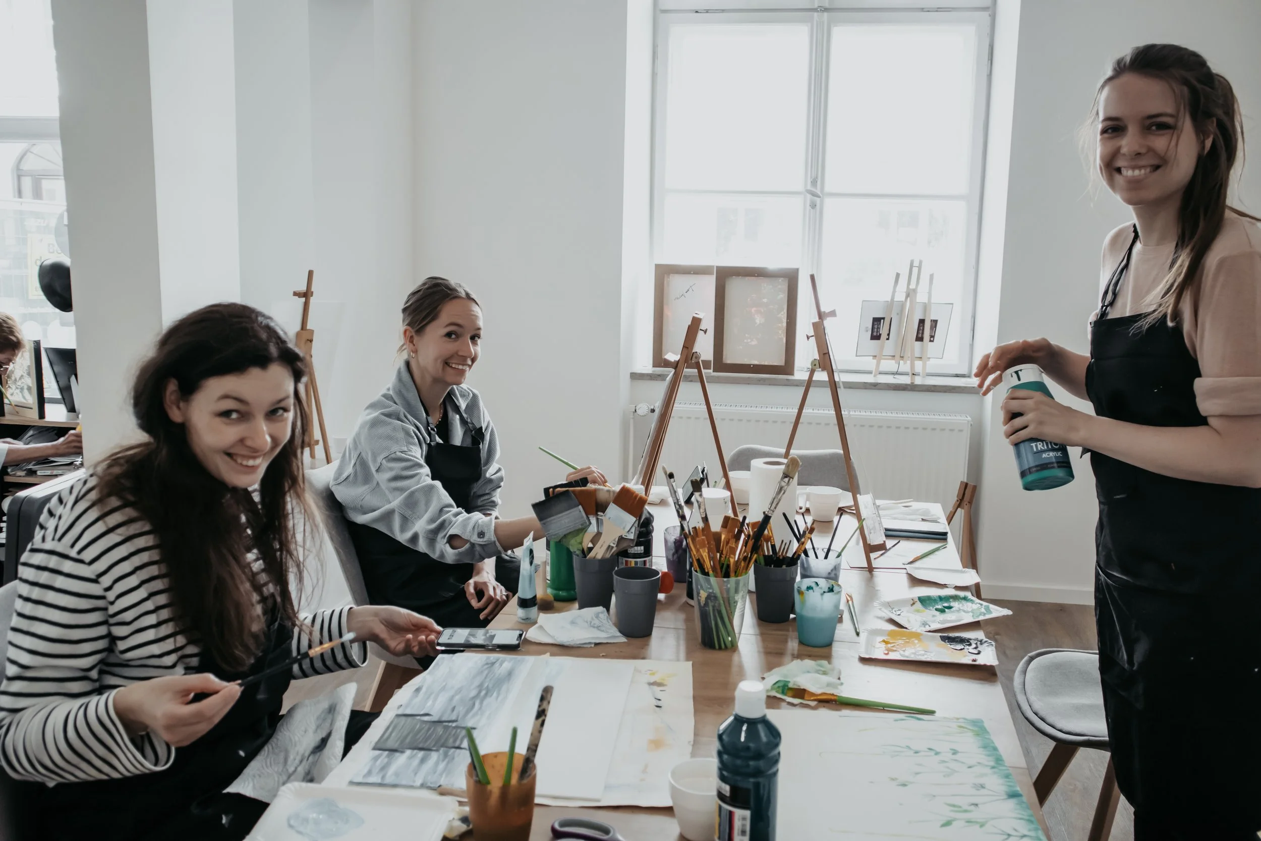Viele Indoor-Alternativen sind entweder sehr passiv (Kino, Dinner, „wir sitzen halt irgendwo“) oder sehr laut (volle Bars, in denen man sich kaum versteht). Ein Mal-Event trifft die goldene Mitte: Ihr habt einen gemeinsamen Fokus, aber keine starre Unterhaltungsschiene. Das Malen gibt Struktur, während Gespräche ganz natürlich entstehen. Wer viel erzählt, plaudert nebenbei. Wer erstmal ruhig ist, hat mit Farben und Formen trotzdem sofort einen Einstieg. Und wenn verschiedene Freundeskreise zusammenkommen, ist das ein echter Vorteil: Es gibt sofort Gesprächsanlässe („Welche Farbe passt dazu?“, „Was malst du?“), ohne dass es gezwungen wirkt.